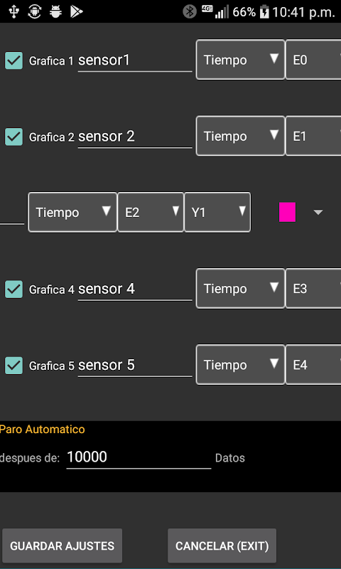 "E0 E1 E2 E3 E4 " cada dato debe venir separado por un espacio y al final tambien debe ir un espacio. puedes enviar 1 dato, 2, 3, maximo deben ser 5. cada dato debe traer al final un espacio incluso si es solo 1 dato. el tiempo del delay( ) en Arduino debe ser exactamente igual al que uses en la app.