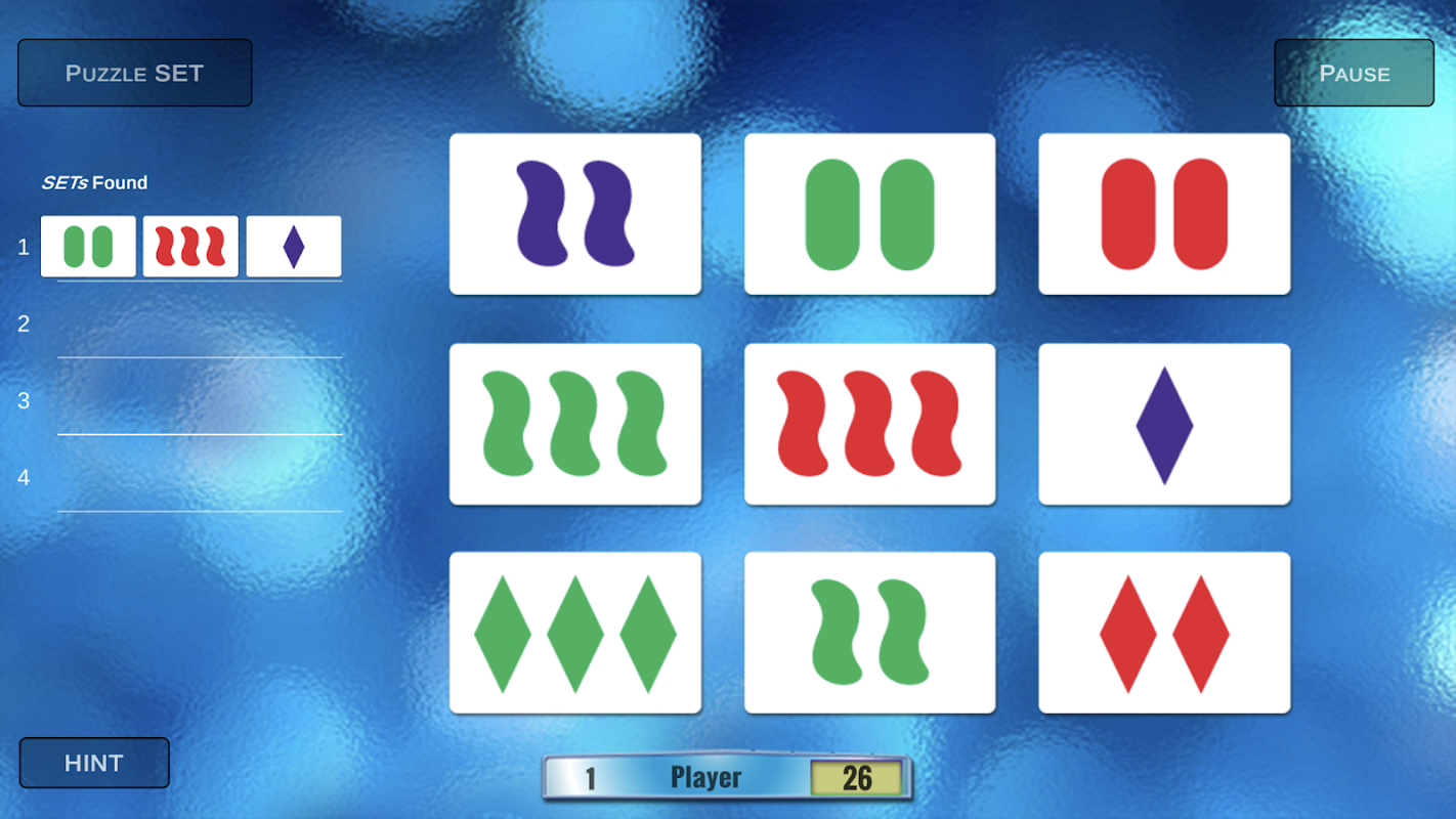 · SET Puzzle te reta a encontrar 4 SETs en 9 cartas (Baraja Básica) o 6 SETs en 12 cartas (Baraja Avanzada) en el menor tiempo posible.
