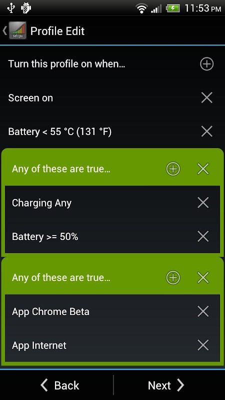 Automatizar SetCPU con perfiles! SetCPU le permite configurar los perfiles de gran alcance para cambiar la configuración bajo ciertas condiciones, tales como qué aplicación se está ejecutando, cuando el teléfono está dormido o carga, cuando el nivel de la batería cae por debajo de un cierto punto, cuando la temperatura del teléfono es demasiado alto, o durante ciertas horas del día. Ver las capturas de pantalla para ver ejemplos de cómo puede configurar los perfiles.
