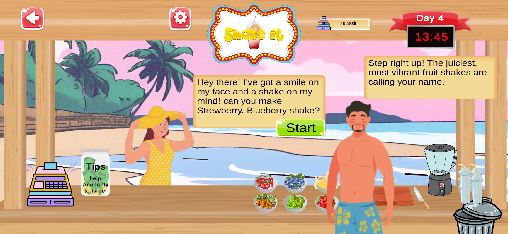 ¡Embárcate en una aventura frutal con Shake It! Sumérgete en el bullicioso mundo de administrar tu propio puesto de batidos de frutas, donde cada día está lleno de colores vibrantes y sabores deliciosos. Desde el momento en que el puesto abre a las 08 a. m. hasta que cierra a las 22 p. m., los clientes acudirán en masa para satisfacer sus antojos de refrescantes batidos de frutas.