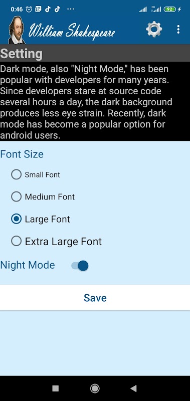 Esta aplicación comprende todo el trabajo de William Shakespeare, incluidas obras de teatro, poemas, sonetos y citas. Todo el trabajo está categorizado de una manera muy sencilla. La aplicación lleva el siguiente material.