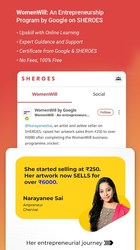 Únase a SHEROES, la comunidad y aplicación de negocios solo para mujeres para el emprendimiento, el empleo y el capital de las mujeres. Mejore sus habilidades con programas de alfabetización empresarial, acceda a oportunidades de trabajo desde el hogar y conéctese con mujeres de ideas afines. Aprenda a través de seminarios web, clases magistrales, sesiones de networking y acceda a oportunidades de ingresos inteligentes. Haz nuevos amigos en un espacio seguro y aprende sobre emprendimiento con mujeres empresarias. Use la línea de ayuda de consejería en línea para obtener apoyo y orientación experta para ayudarlo a administrar su vida profesional, financiera y personal.