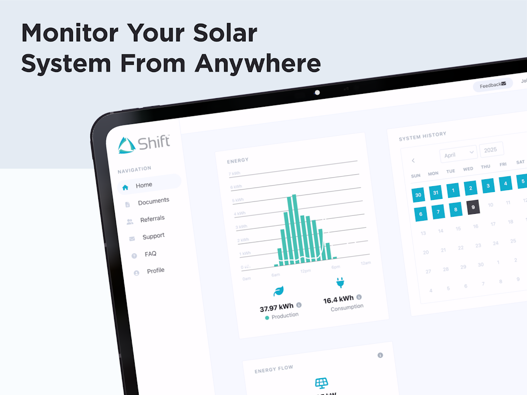 Realice un seguimiento de su proceso de instalación en tiempo real, controle su producción y consumo de energía solar una vez que su sistema haya sido instalado, gane dinero recomendando a sus amigos y familiares, abra un nuevo ticket de soporte o actualice los detalles de su cuenta con la aplicación Shift.