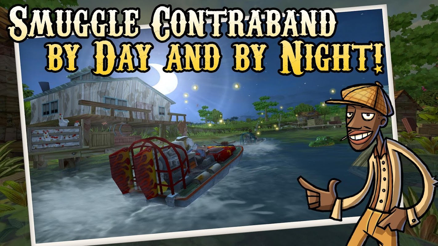 Pon tu lancha de fondo plano a toda velocidad y deslízate por las aguas fangosas del pantano remoto. Atraviesa un mundo destructible lleno de chozas destartaladas, barcos de pesca, gallineros, caimanes y mucho más. Llena tu bodega de carga hasta el tope con licor ilegal, tabaco, aceite de serpiente y demás contrabando, y véndelo al mejor postor en una desenfrenada carrera de 10 días por la gloria y las ganancias. Eso sí, no pierdas de vista a Smokey: cuanto más famoso te vuelvas, más policías te perseguirán.