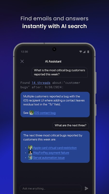 Utilice la búsqueda impulsada por IA para encontrar correos electrónicos rápidamente o para analizar los correos electrónicos y archivos adjuntos de todo su equipo para obtener las respuestas que necesita.