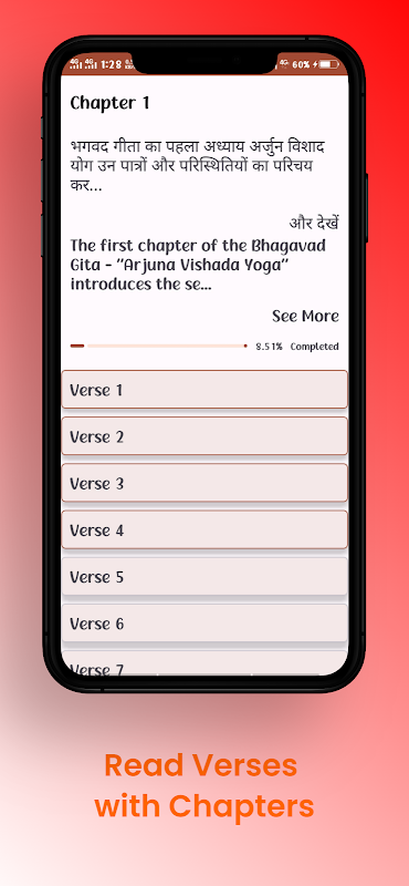 Descubra el Bhagavad Gita completo, que consta de 18 capítulos y los 700 shlokas (versos), con significados detallados y explicaciones para cada uno. Esta aplicación garantiza que puedas profundizar en la sabiduría eterna del Bhagavad Gita, explorando sus profundos mensajes e ideas.