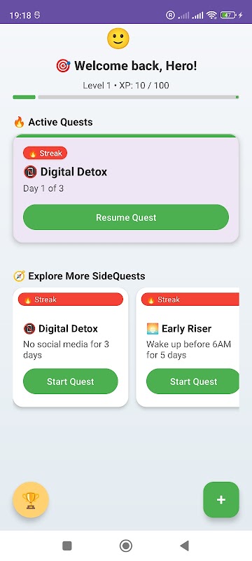 SideQuest te ayuda a desarrollar mejores hábitos, realizar un seguimiento de tu estado de ánimo y reflexionar a diario, todo a través de misiones divertidas y breves.
