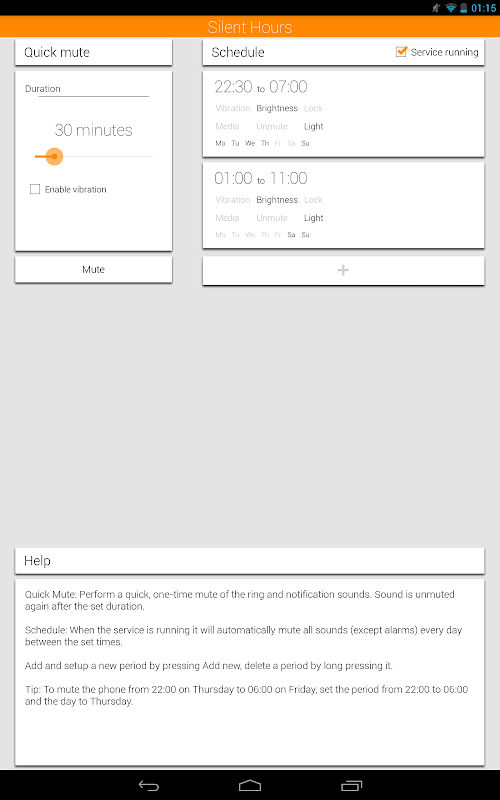 - Now works on Android 5.0 Lollipop! (NOTE: The volume will be locked when the app silences the device, you will have to change the notification mode to "All" to abort the silent period prematurely)