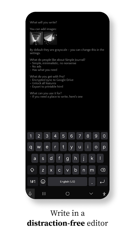 ¿Necesitas un lugar para escribir? Trabaja en tus pensamientos y toma notas. Ideal para escritores y para cualquiera que necesite despejar la mente. Escribir aporta claridad y Simple Journal está diseñado para ello.