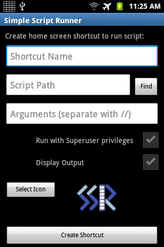 Simple Script Runner le permite crear accesos directos a la pantalla de inicio que ejecutarán sus secuencias de comando, solicitando argumentos si es necesario.