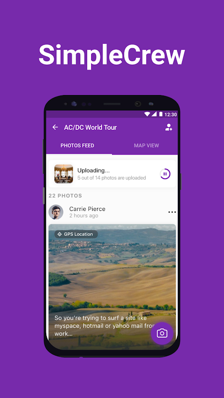 SimpleCrew es una plataforma de mercadotecnia de equipos callejeros diseñada para ayudar a los equipos callejeros a subir fotos para probar el progreso de su campaña e informar su trabajo a clientes y gerentes, sin agotar la batería de su teléfono, estrellarse o tener que desinstalar y reinstalar la aplicación. Nunca retrasará sus informes, comerá sus datos o se congelará o retrasará cuando lo necesite para funcionar.