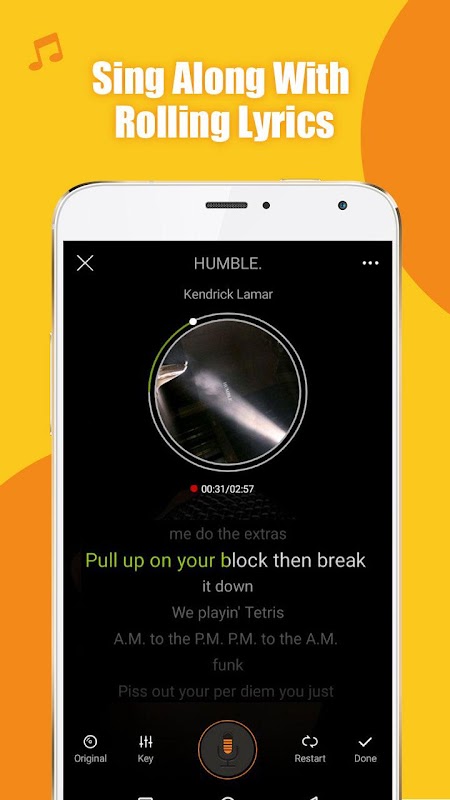 Sing along to the scrolling lyrics while singing your favorite song, add special sound effects to your recordings like Pop, Rock, Hip Pop, R&B, Electronic, Phonograph and Jazz Bright, adjust your vocal volume and karaoke volume as well as vocal timing. The pitch of the song is too high? Try to Adjust the Key for your vocal’s good. Now let’s sing!