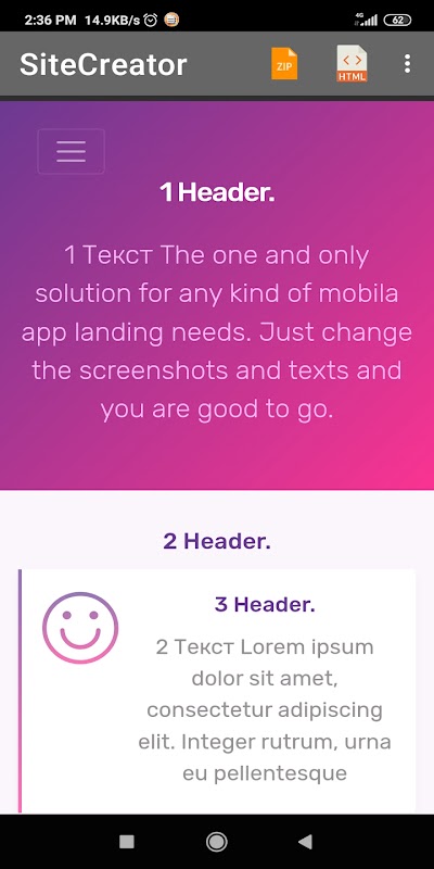 ✔ En la versión gratuita de la aplicación, puedes utilizar las dos primeras plantillas para editar. Para obtener acceso completo a todas las plantillas, puede comprar la versión paga de la aplicación Site Creator Pro a bajo costo: