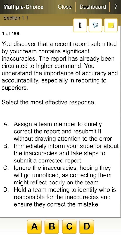 La Guía SJT para PFE plantea una situación de la vida real y le pide que seleccione las respuestas más o menos efectivas entre una selección de cuatro posibilidades. Los fundamentos detallados proporcionan explicaciones concisas de las acciones más o menos efectivas a tomar en cada situación.