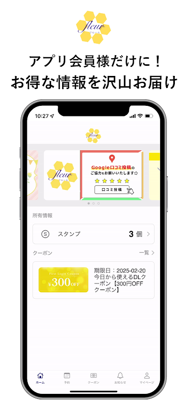 Puede recibir la información y las ofertas más recientes del salón de cuidado de la piel fleur a través de la aplicación. También podrás consultar el menú, la franja horaria deseada y realizar reservas desde tu smartphone en cualquier momento. Al instalar la aplicación, podrá utilizar el salón de cuidado de la piel Fleur de forma más cómoda.