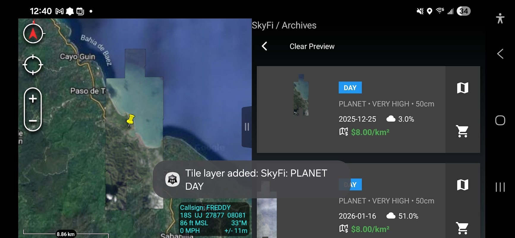 Integre perfectamente las capacidades de asignación y pedido de imágenes satelitales de SkyFi directamente en su ecosistema CIVTAK o ATAK. Obtenga acceso bajo demanda a inteligencia geoespacial crítica y tome decisiones rápidas e informadas sobre el terreno.