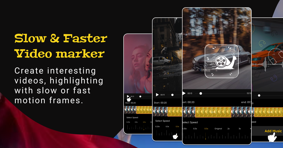 Las aplicaciones de video en cámara lenta y cámara rápida lo ayudarán a crear videos extremadamente interesantes, resaltando con marcos de cámara lenta o rápida.