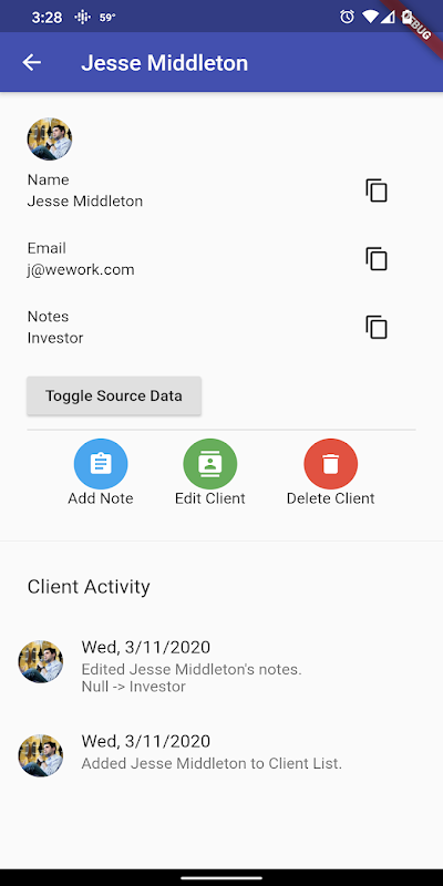 • Use the CRM app to enter client details like name, status, email picture and contact information
