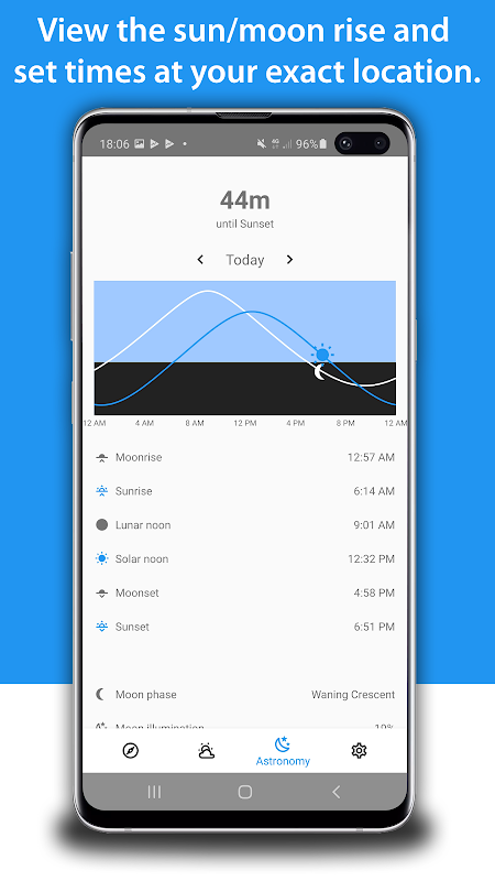 Otra herramienta útil de esta brújula es determinar la hora de salida y puesta del sol. Vea las horas de salida y puesta de la luna y vea la fase lunar actual en su ubicación exacta.