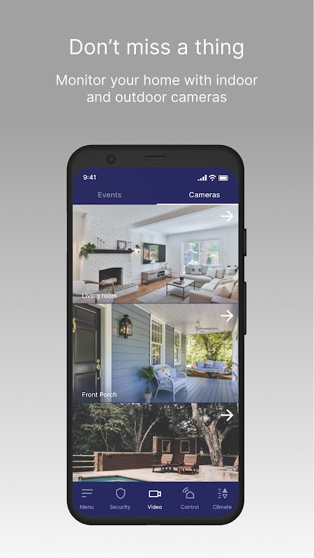 Reciba el estado de la alarma en tiempo real y active o desactive su sistema de seguridad de forma remota. Reciba alertas instantáneas en caso de una alarma de seguridad, o simplemente para recibir una notificación cuando su familia llegue a casa.