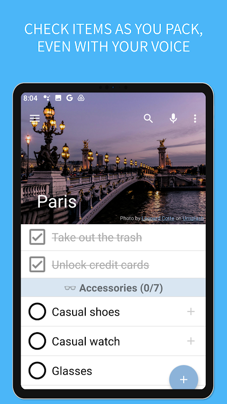 Puedes añadir tus propios artículos y actividades, e incluso usar la IA para obtener sugerencias. Cuando tu lista esté lista, puedes empezar a empacar sin siquiera mirar tu teléfono gracias al Modo Voz, donde la app leerá la lista en voz alta secuencialmente y esperará tu confirmación a medida que empaquetas cada artículo. ¡Y estas son solo algunas de las potentes funciones que encontrarás en SmartPack!