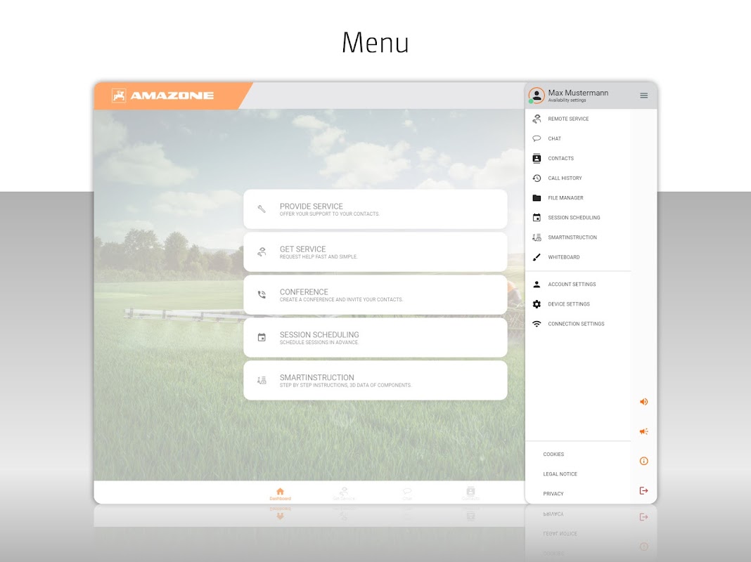 La aplicación Amazone Service proporciona comunicación de voz y video en vivo desde técnicos en el sitio a uno o más expertos remotos. El único requisito para la aplicación Amazone Service es una tableta o un ordenador portátil con cámara y conexión a Internet. La calidad de la imagen está especialmente optimizada para el servicio y el mantenimiento. Para mantener el control total de todo el contenido, la aplicación de servicio Amazone está protegida con las últimas tecnologías de cifrado.