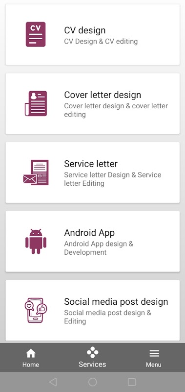 Ofrecemos servicios de diseño de CV y cartas, diseño gráfico, creación de publicaciones para redes sociales y diseño y desarrollo de apps para Android.