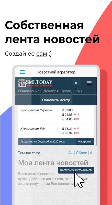 Smi.today - бесплатный автоматический агрегатор новостей Украины, России, стран СНГ. Проект был создан, что бы сократить время на поиск и анализ новостей, а так же ускорить возможность получения только свежие новости, из проверенных источников, на одной странице. Ежедневно более 100 000 человек из разных уголков мира посещают наш проект, и более 100 популярных СМИ опубликовали положительные отзывы о нашем проекте.