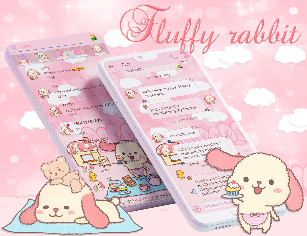 ¡Descargue este tema especial SMS rosa gratis ahora! y cambie completamente el aspecto de su teléfono inteligente Android con el messenger rosa. Te encantará este cambiador de temas de sms para personalizar tu teléfono Android con un nuevo estilo de temas de sms 2020 y un fondo de pantalla de conejo brillante.