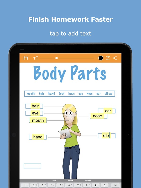 Con SnapType, los estudiantes pueden tomar una foto de sus hojas de trabajo o importar hojas de trabajo desde la galería de fotos. Luego pueden usar el teclado de su dispositivo Android para agregar texto a estos documentos. Cuando se completa, los estudiantes pueden imprimir, enviar por correo electrónico o compartir sus creaciones (compartir requiere actualizar a SnapType Pro). Es la solución perfecta para niños, e incluso adultos, que luchan con su letra.