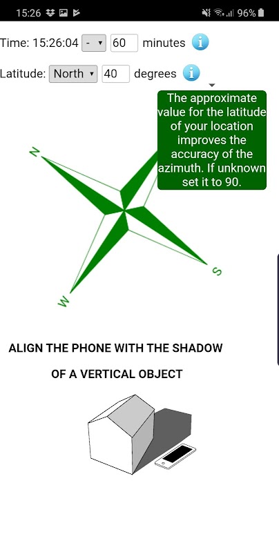 Esta aplicación indica True North cuando el teléfono está correctamente alineado con la sombra de un objeto vertical.