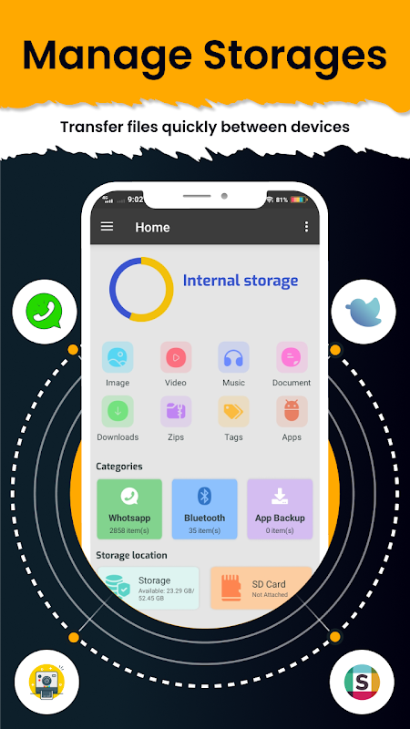 Con este explorador de archivos, puede liberar el espacio de almacenamiento de su teléfono de manera muy fácil y eficiente. Esto lo ayuda a organizar rápidamente los archivos y administrar los archivos de su teléfono como desee, sin tráfico, y transferir archivos de forma rápida y segura con sus amigos.