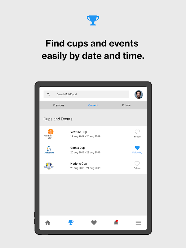 A través de la función de búsqueda de la aplicación, puede encontrar el equipo, la asociación o la copa que está buscando. Hay varios miles de retransmisiones en Solidsport de todos los equipos y asociaciones posibles.