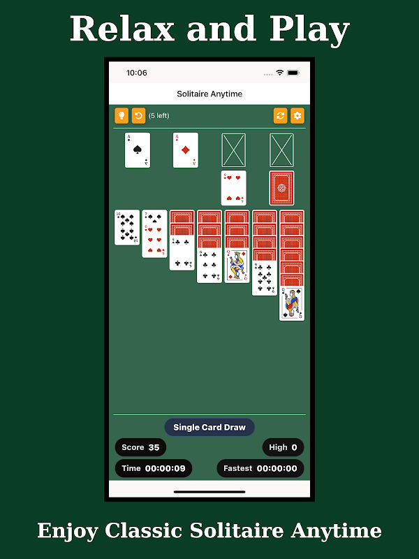 Disfruta del Solitario clásico sin anuncios ni seguimiento. Solitaire Anytime te permite elegir entre robar una o tres cartas, activar la puntuación Vegas, usar consejos inteligentes, establecer un límite de deshacer e incluso jugar con un temporizador de cuenta regresiva para sesiones rápidas. Todo funciona sin conexión; no necesitas cuenta.