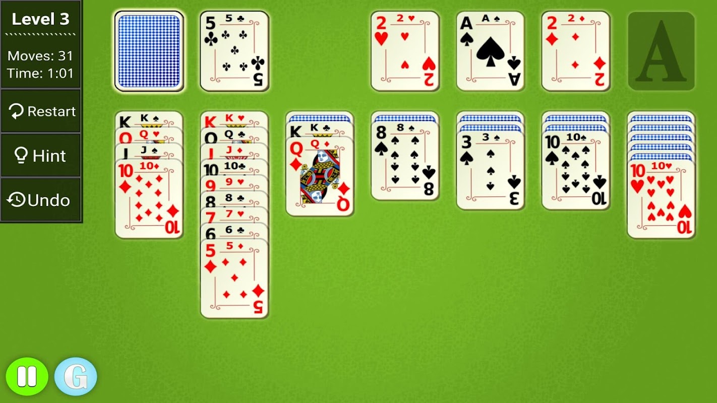 ♣ En este juego tienes que construir 4 montones de cartas del mismo palo en cada una de las 4 pilas de base de la parte superior de la pantalla. Cada una de las pilas de base debe empezar con un as y terminar con un rey.