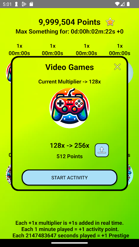 ¡Desbloquea los secretos del tiempo en "Algo", donde cada segundo cuenta! Comienza con 8 actividades únicas, cada una con sus propios desafíos. Sube de nivel estas actividades para aumentar tu multiplicador de tiempo, haciendo que cada momento sea más valioso.
