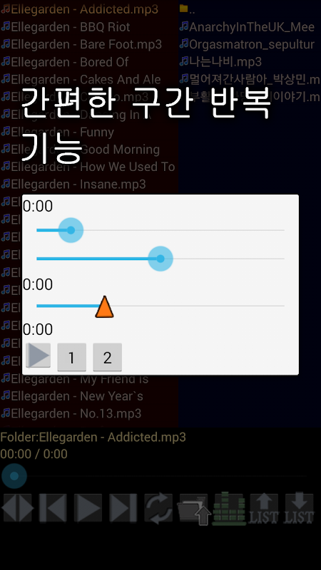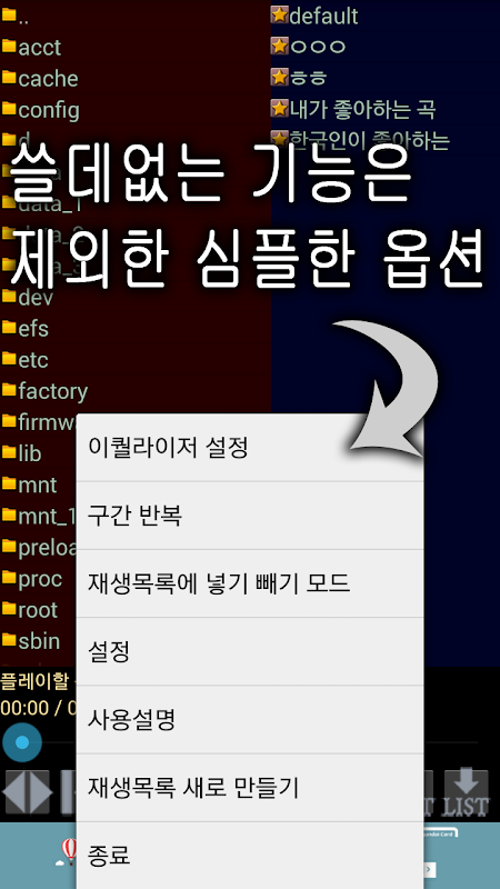 가장 심플하고 가벼운 음악재생 어플. 손쉬운 리스트 정리, 폴더별, 재생리스트 별 재생.필요한 기능만 있고 쓸대없는 기능은 없다!