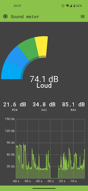 El medidor de sonido es un medidor de nivel de sonido (o SPL) simple y fácil de usar para su dispositivo Android. En su interfaz fácil de usar, muestra los niveles de ruido actuales a tu alrededor. valores de decibelios mínimo/promedio/máximo, y advertencias de niveles altos de ruido. También cuenta con gráfico con valores medidos para el último minuto. El medidor de sonido es una herramienta esencial para aquellos que sienten curiosidad por los niveles de sonido que los rodean.