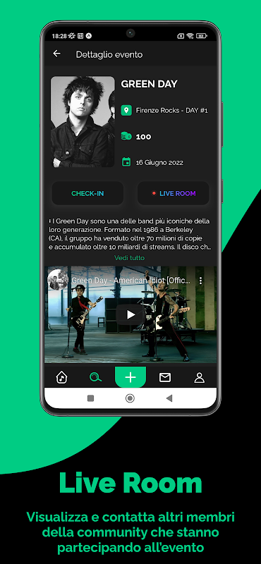 > Con la función LIVE ROOM, mientras asistes a un concierto o festival, puedes ver, contactar y conocer a otros miembros de la comunidad que, como tú, se han registrado para ese evento