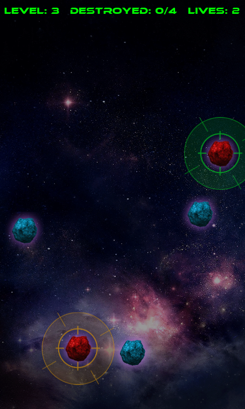 Para superar cada nivel es necesario destruir varios asteroides cuando estén de color rojo y se conviertan en objetivos. Si se pulsa un asteroide de otro color se pierde una vida.
