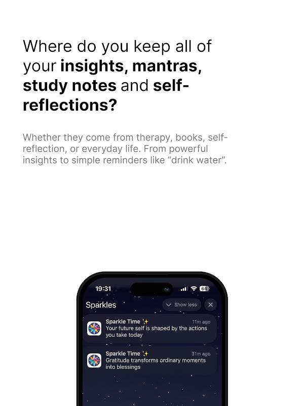 Ya sea que se trate de un avance terapéutico, un mantra consciente o una nota del curso que debes recordar, Sparkles te mantiene conectado con lo más importante. Con notificaciones aleatorias y hermosos widgets en la pantalla de inicio que muestran tus pensamientos, hábitos y objetivos, nunca perderás el contacto con tu viaje de crecimiento personal.
