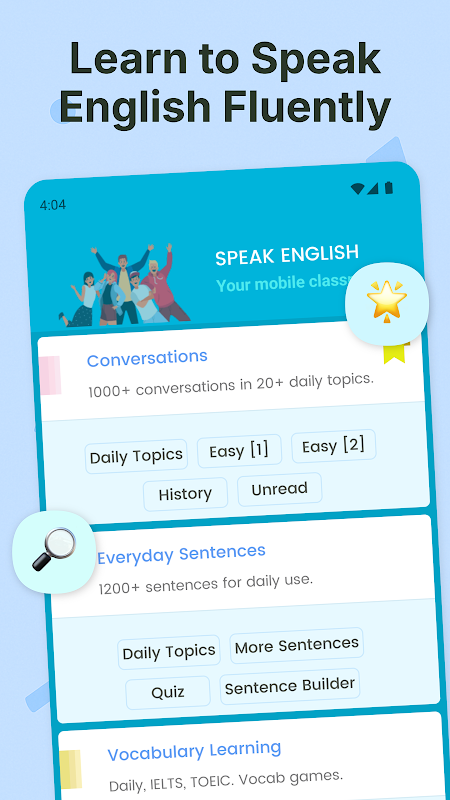 Nuestra aplicación tiene una gran cantidad de frases de comunicación clasificadas en muchos temas de conversación en inglés reales que serán una herramienta eficaz durante su práctica de habla inglesa.