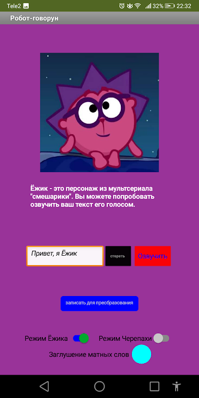 Podrás expresar el texto con la voz de un personaje de la serie animada "Smeshariki". La voz es similar a la voz del personaje no es del todo precisa, pero la similitud se siente claramente.