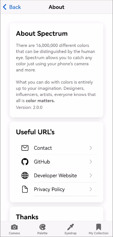 Spectrum App; This app can detect the colors it sees on the camera and tell you about: - Colors Universal name - Computer code (Hex) - Mathematical code (RBB) - Mixing ratio (MIXRATE) and other information. - CMYK CODE - HSV CODE