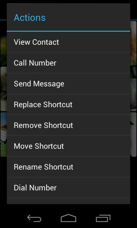 R: Si usted ha configurado los accesos directos de contacto, dos acciones principales se pueden realizar. Un corto o un largo clic. Por defecto un breve clic llama al número almacenado en el acceso directo y una larga clic abre el menú contextual para iniciar diferentes acciones como el número de llamadas, enviar mensajes de texto, ver el contacto, enviar un mensaje de WhatsApp, mostrar la dirección del contacto en Google Maps, enviar Correo electrónico y también sustituir, eliminar o mover un acceso directo. Acciones a corto y largo clic se pueden sobrescribir con otras acciones. Tenga en cuenta que si cambia el 'Haga clic en Acción Long', el menú contextual no estará disponible ya. En su lugar se puede utilizar 'Acciones' en el menú principal.