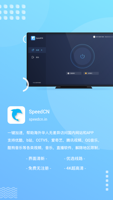 一键开启SpeedCN 加速,看片追剧告别卡顿,流畅追剧。