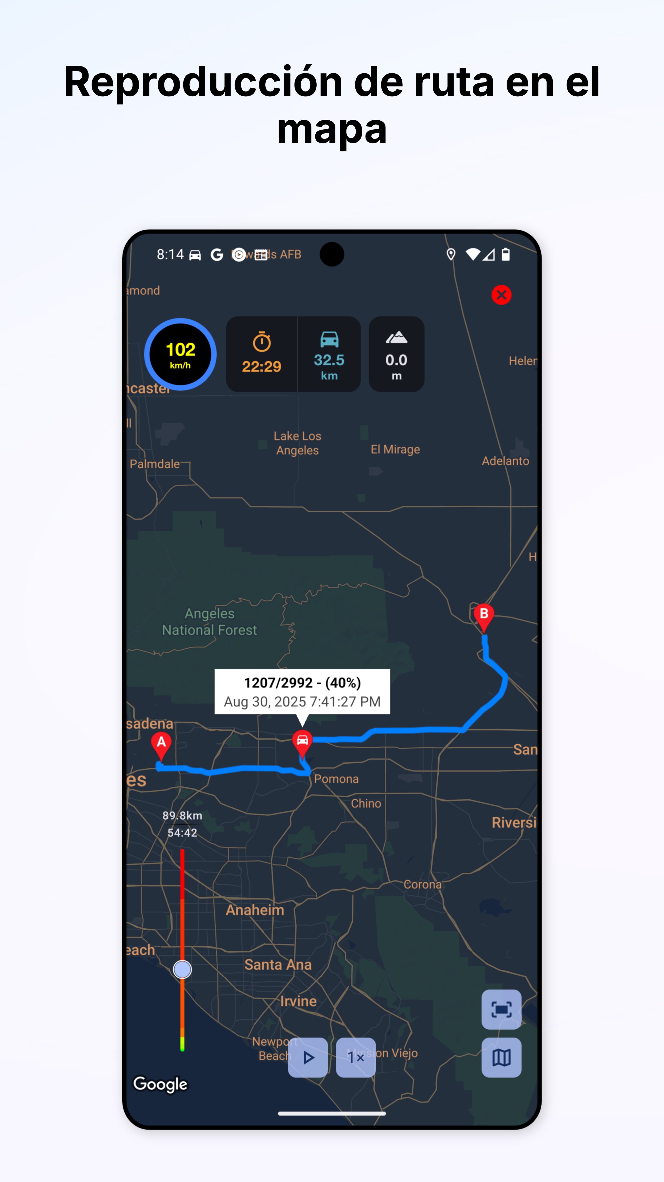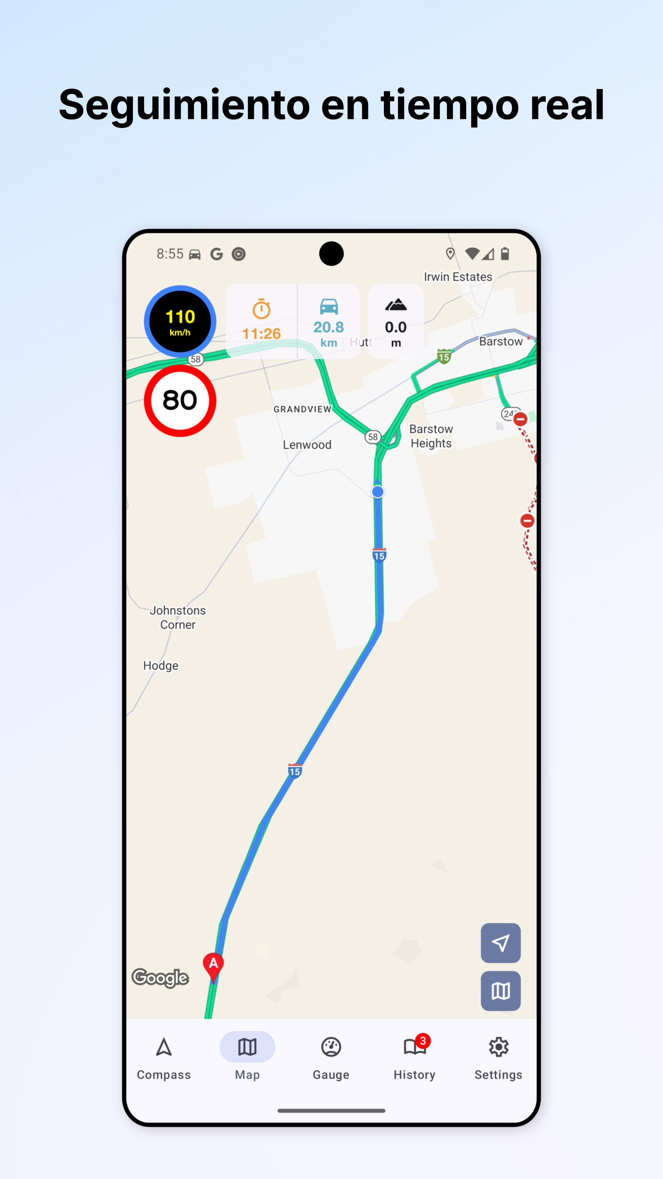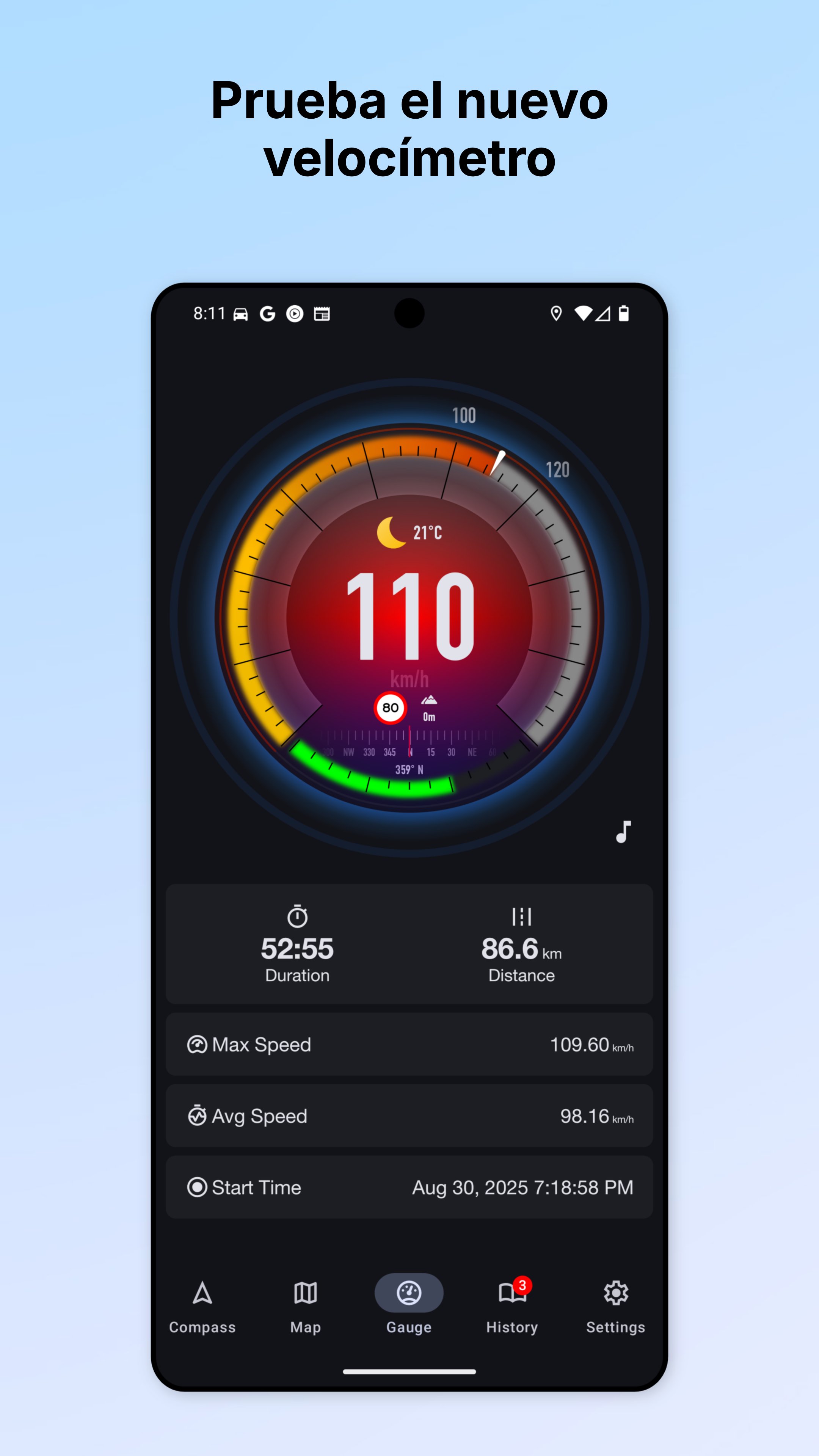Monitorea tu velocidad, dirección y ubicación en tiempo real, y guarda tus rutas automáticamente. Ideal para conducir, andar en bicicleta o hacer senderismo.
