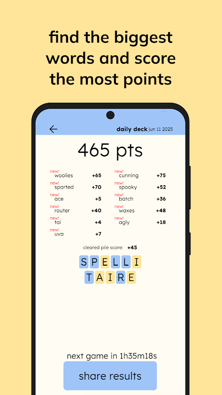 - Baraja diaria (60 cartas): Todos juegan el mismo pasatiempo cada día. Comparte tu puntuación y compárala con tus amigos.