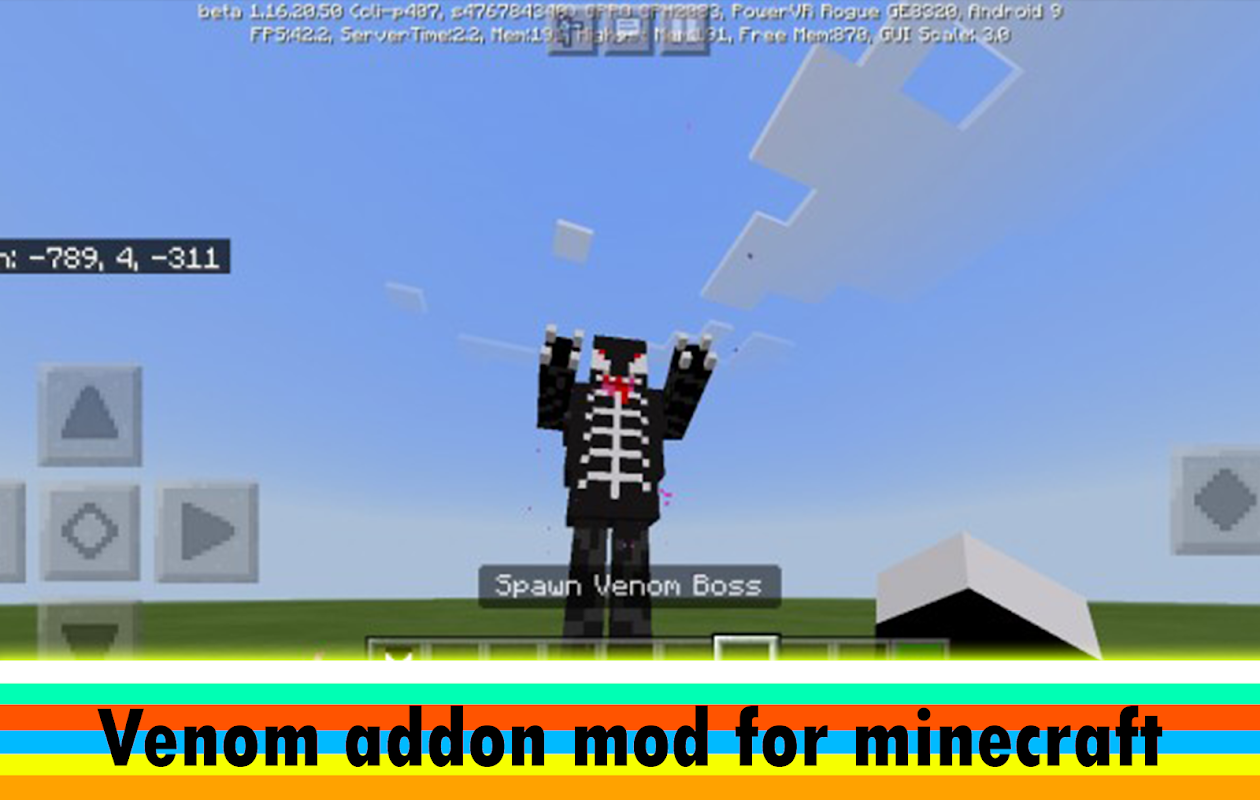 Fantástico superhéroe del universo Marvel para mcpe Venom será una excelente adición a tu juego. Esta araña negra tiene una fuerza irreal y súper habilidades y tiene muchas máscaras y animaciones cuando ataca a su oponente. Como saben, es una criatura alienígena que vino de una galaxia lejana para conquistar el mundo, este es un súper villano muy inteligente de una forma líquida y pegajosa, ¡para existir necesita conectarse con una persona! Usa tu inventario para conectar a tu personaje con Venom. En nuestro mod, puedes usarlo como un buen héroe para proteger a tu gente, animales y la ciudad en general de monstruos, turbas y criaturas zombis. Con la ayuda de sus características, podrás volar alto como un dragón, moverte a mayor velocidad y lanzar una interminable telaraña negra que inflige daño. Fabricar una araña tóxica es muy simple y rápido. Encontrarás recetas y máscaras para una araña oscura en tu inventario. Para un juego más divertido, también descargue este complemento y otros superhéroes como Hulk, Iron Man, Black Panther.