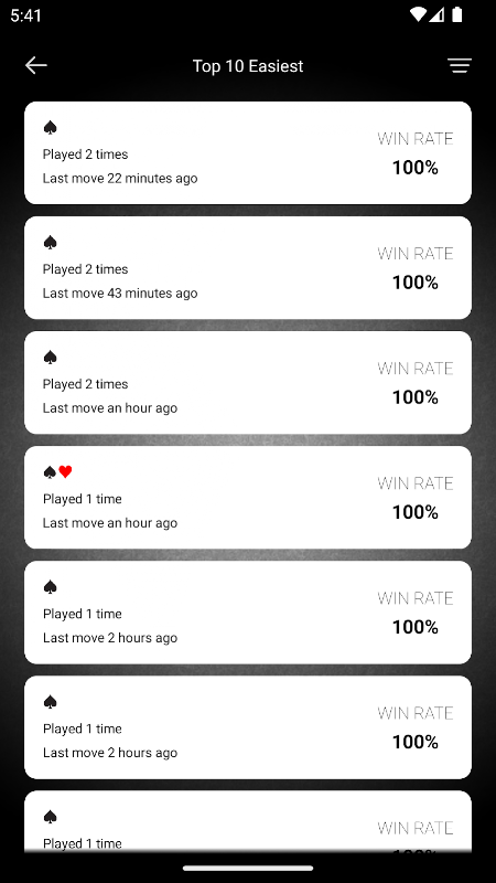 Ordena las partidas por porcentaje de victorias o por partidas recientes; selecciona el juego más difícil para desafiarte o el más fácil para relajarte.